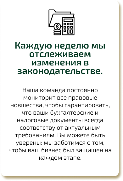 Наша команда постоянно мониторит все правовые новшества, чтобы гарантировать, что ваши бухгалтерские и налоговые документы всегда соответствуют актуальным требованиям. Вы можете быть уверены: мы заботимся о том, чтобы ваш бизнес был защищен на каждом этапе.