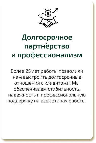 Более 25 лет работы позволили нам выстроить долгосрочные отношения с клиентами. Мы обеспечиваем стабильность, надежность и профессиональную поддержку на всех этапах работы.