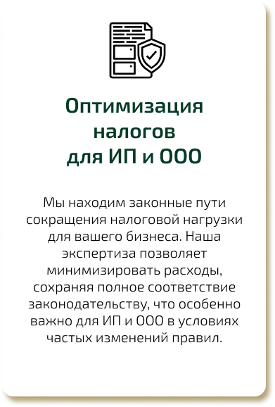 Мы находим законные пути сокращения налоговой нагрузки для вашего бизнеса. Наша экспертиза позволяет минимизировать расходы, сохраняя полное соответствие законодательству, что особенно важно для ИП и ООО в условиях частых изменений правил.