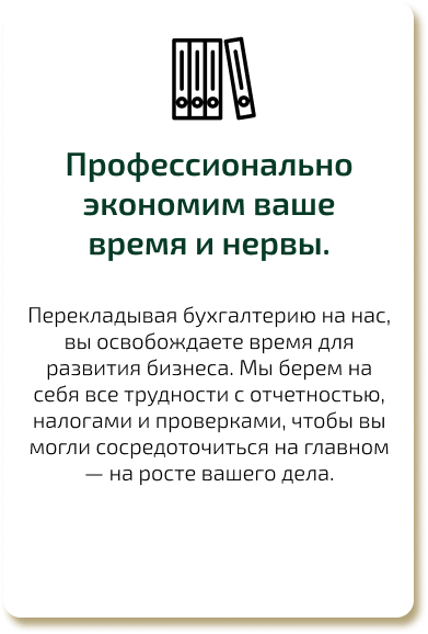 Перекладывая бухгалтерию на нас, вы освобождаете время для развития бизнеса. Мы берем на себя все трудности с отчетностью, налогами и проверками, чтобы вы могли сосредоточиться на главном — на росте вашего дела.