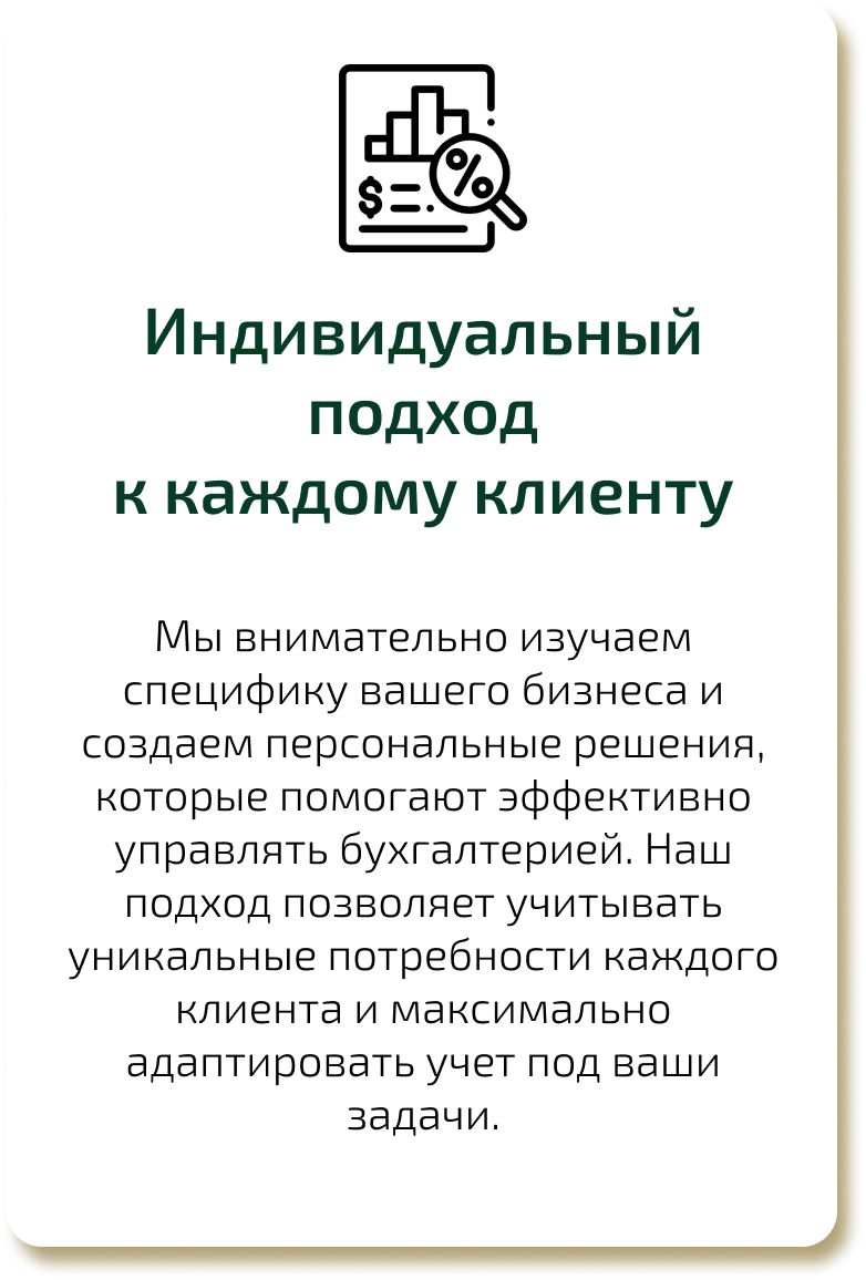 Мы внимательно изучаем специфику вашего бизнеса и создаем персональные решения, которые помогают эффективно управлять бухгалтерией. Наш подход позволяет учитывать уникальные потребности каждого клиента и максимально адаптировать учет под ваши задачи.